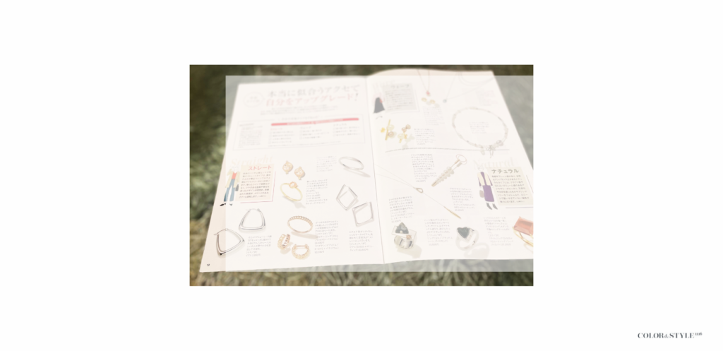 本誌では、ストレート・ウェーブ・ナチュラルという骨格3タイプ別に似合うジュエリーの選び方を、実際の商品とともにビジュアルでわかりやすくご紹介しています。
